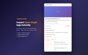 OG Link Preview เป็นส่วนขยาย Chrome ฟรีที่ออกแบบมาสำหรับนักพัฒนาและผู้สร้างเนื้อหาเพื่อให้สามารถตรวจสอบแท็กเมตา Open Graph และ Twitter Card ได้อย่างรวดเร็วในหน้าเว็บใด ๆ เครื่องมือนี้ช่วยกำจัดความจำเป็นในการค้นหาซอร์สเพจด้วยตนเองโดยการจัดเตรียมมุมมองที่เป็นระเบียบของแท็กที่เกี่ยวข้องทั้งหมดในที่เดียว พร้อมด้วยการตรวจจับการสำรองสำหรับแท็กเมตาสแตนดาร์ด อินเทอร์เฟซใช้งานง่าย ช่วยให้สามารถนำทางระหว่างแท็บได้อย่างราบรื่นเพื่อการเรียกดูข้อมูลเมตาที่มีประสิทธิภาพ